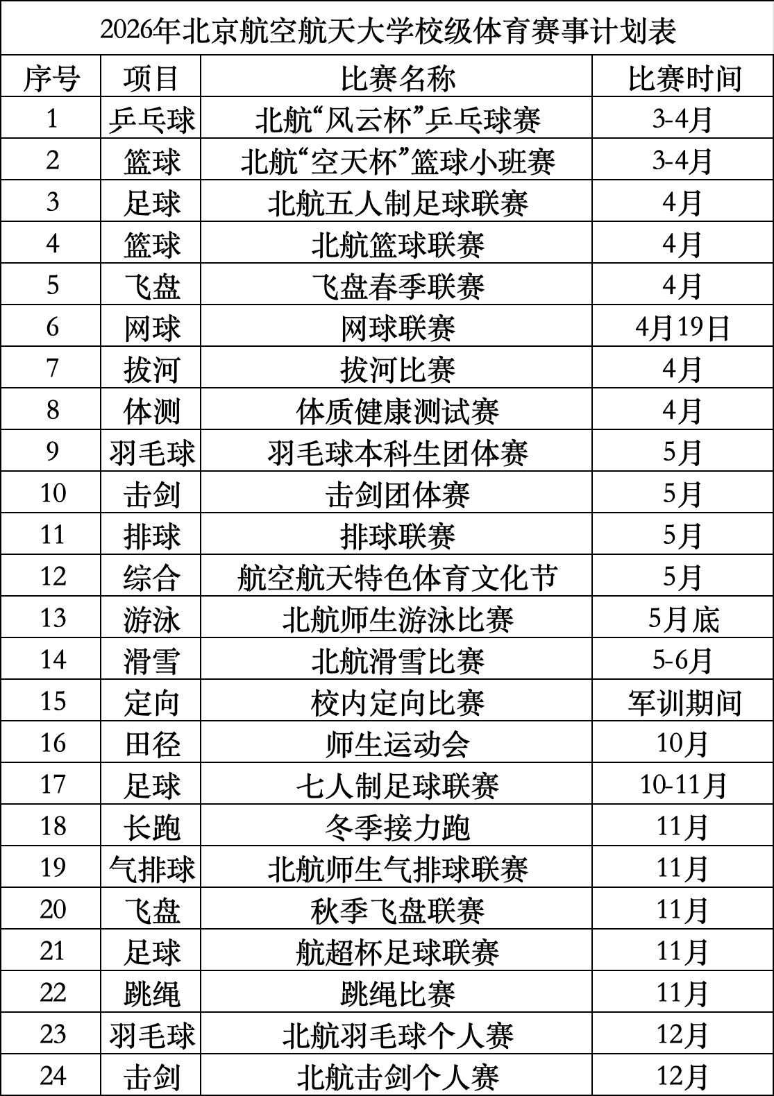 2026年北京航空航天大学校级体育赛事计划表